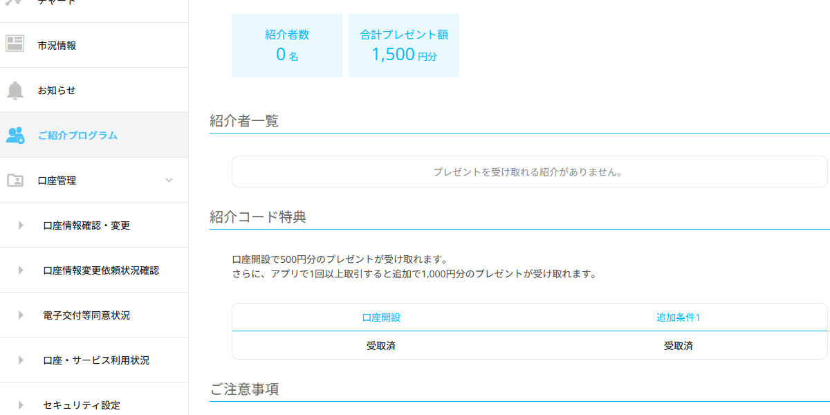 口座の開設が完了したらBITPOINTの管理画面にログインしますと、紹介特典が受け取れます。