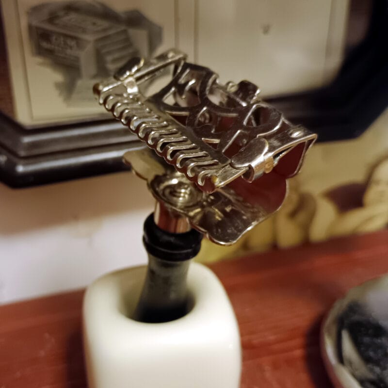 1本目のL’ESSOR CSCF Rasoirではウェッジ刃を研ぐ際、同梱の研ぎ用ハンドルを使って研いでました。