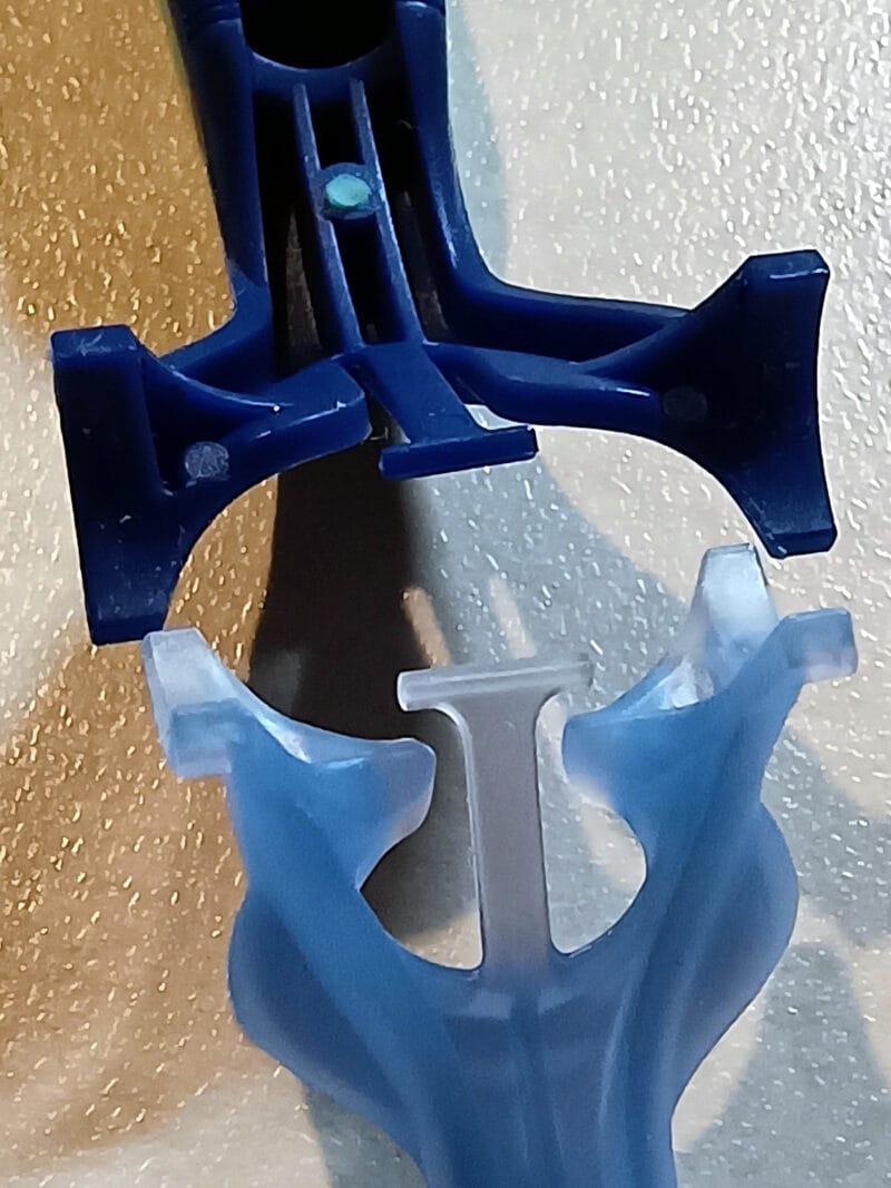 写真上がセンサーExcelホルダーにカスタムPlus3替刃、下がカスタムPlus3ホルダーにセンサーExcel替刃を装着した様子です。