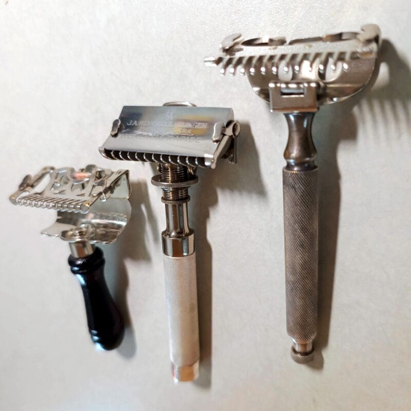 左から、L’ESSOR CSCF Rasoir、ASR Ever-Ready lather cather、Henckels RAPIDEです。